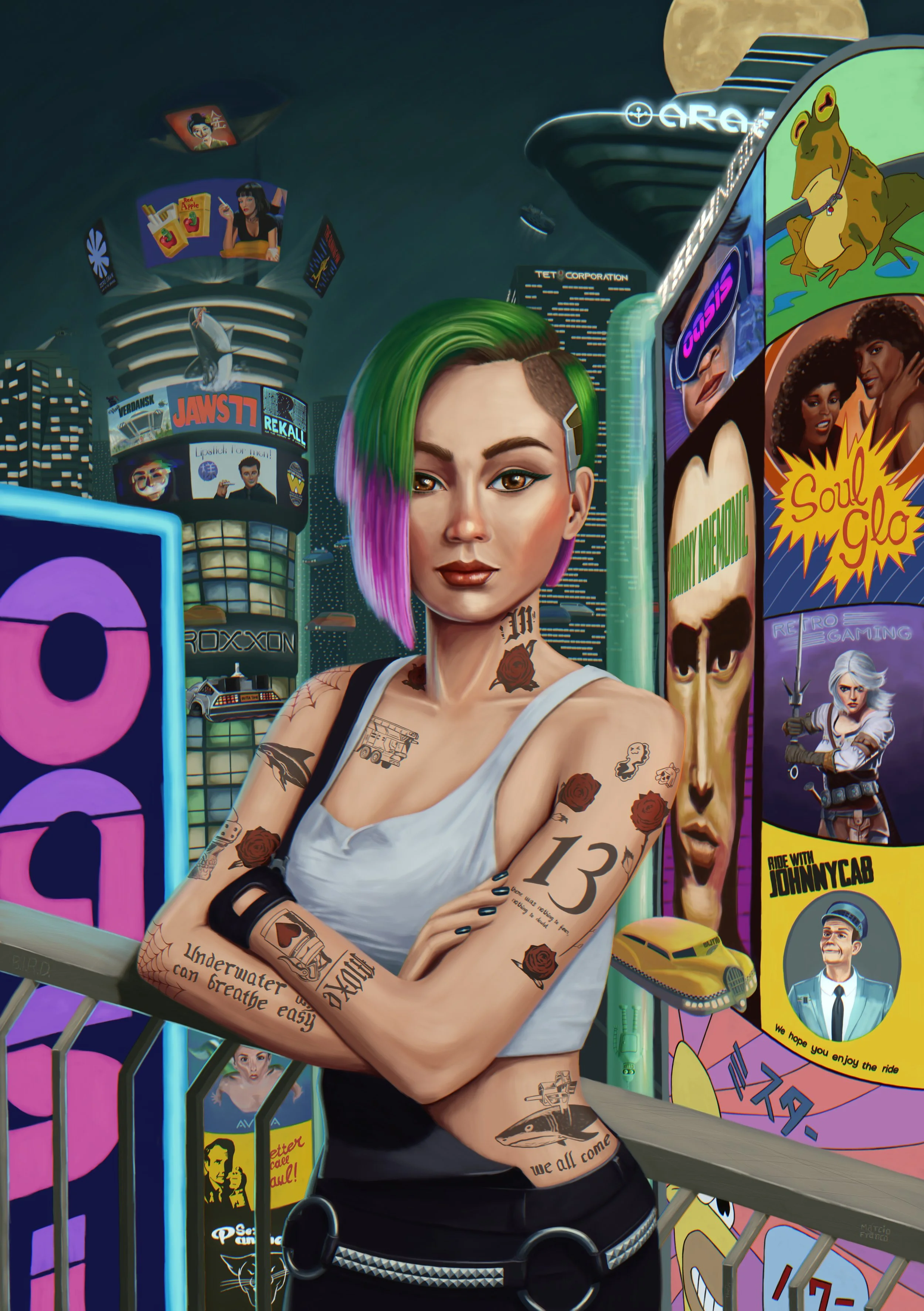 I deliberately loaded the background with a detailed collection of pop culture references and Easter eggs. This intricate design choice allowed me to celebrate a wide range of my personal influences, from classic science fiction and films (Ready Player One, Back to the Future) to beloved TV shows (The Simpsons, Futurama, Friends) and other iconic media. The piece is designed to reward the viewer with a sense of discovery, inviting them to browse the crowded skyline for familiar elements.