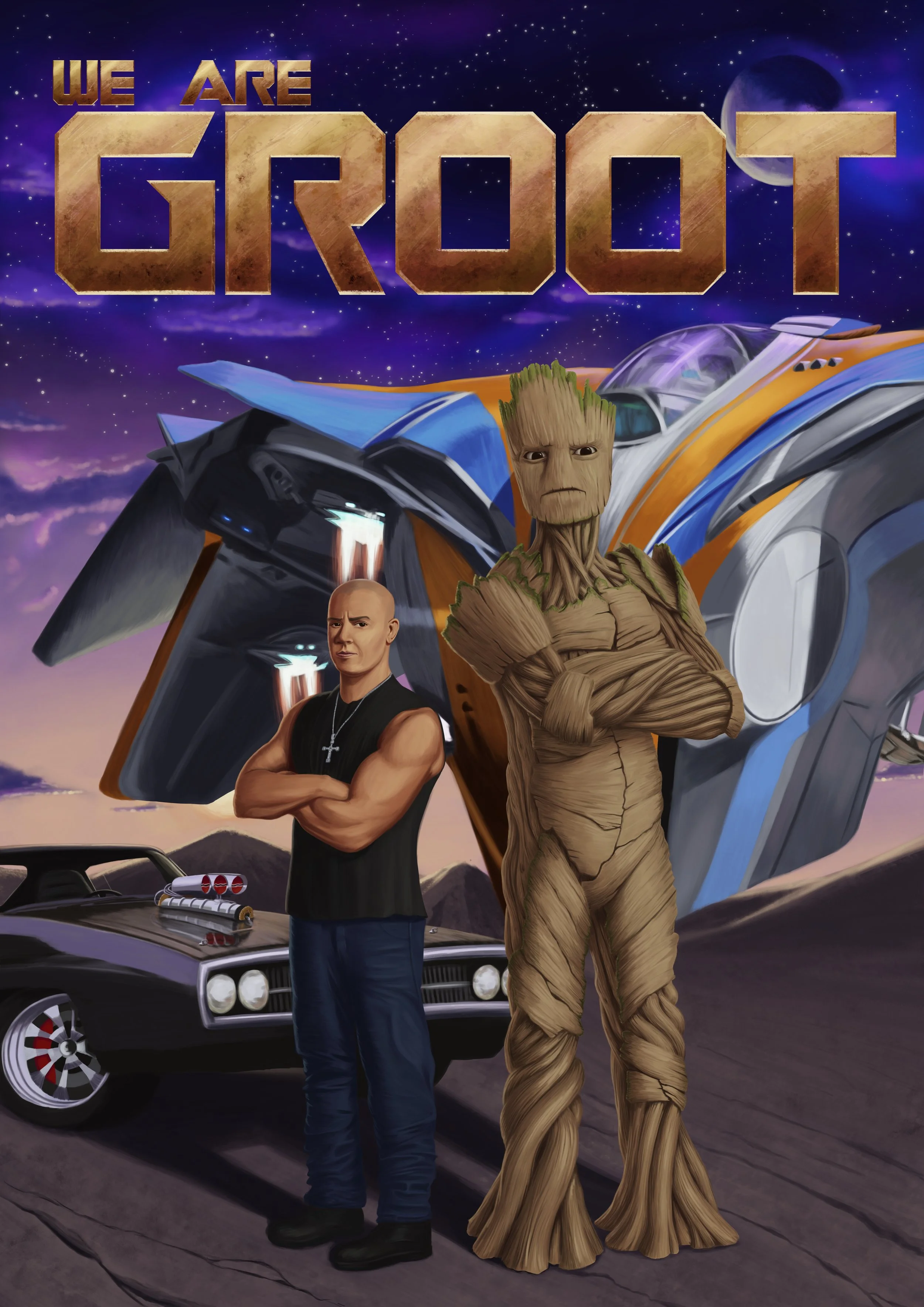 This digital painting is a fan-inspired tribute to two of the biggest film franchises, Guardians of the Galaxy and Fast & Furious, specifically celebrating the shared presence of actor Vin Diesel in both. The illustration features his characters, the stoic Dominic Toretto and the lovable tree-creature Groot, standing together against a cosmic backdrop that includes Dom's classic Dodge Charger and the Guardians' ship, the Milano.