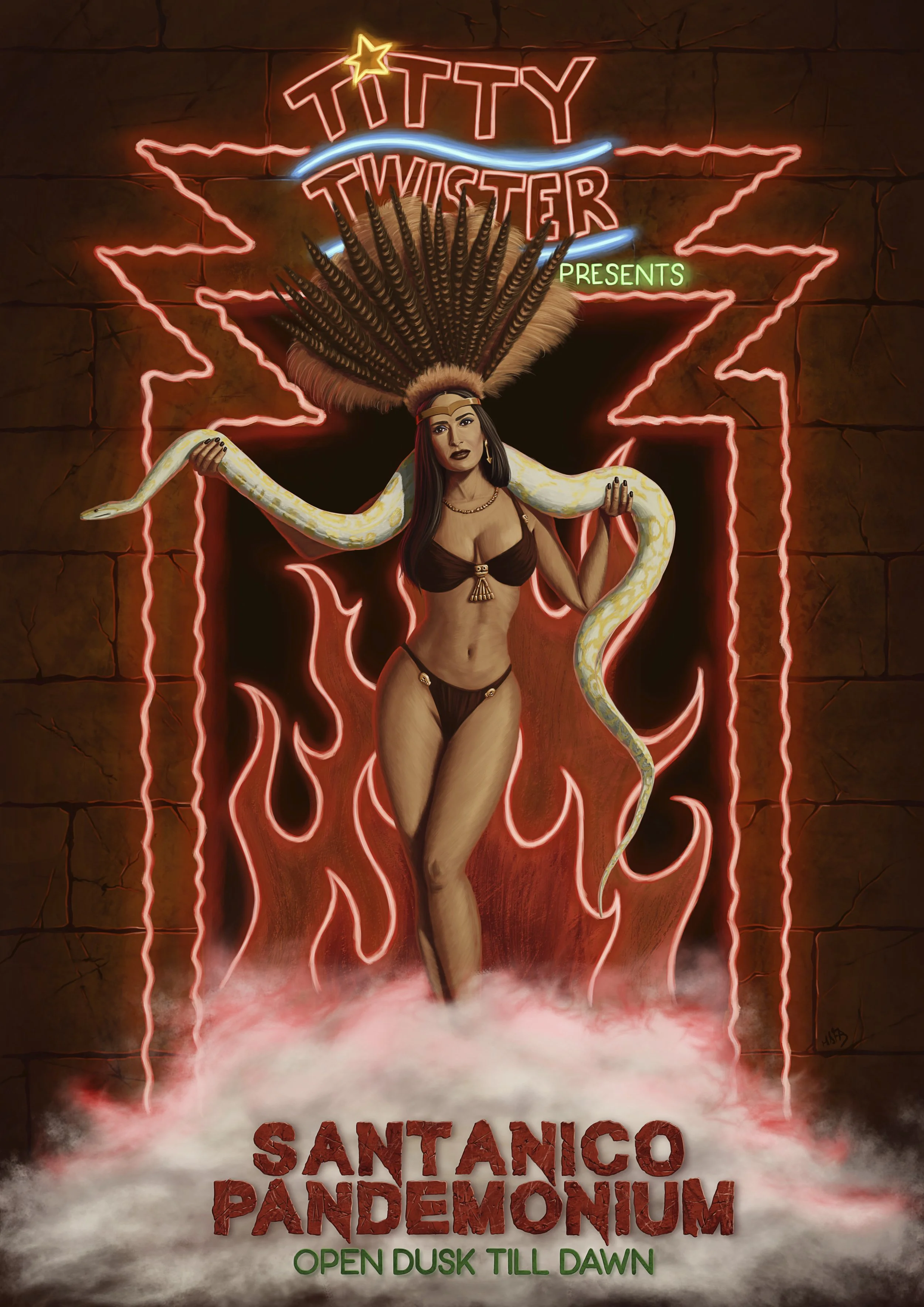 This piece is a fan-art tribute to the iconic character Santanico Pandemonium (played by Salma Hayek) from the 1996 film, From Dusk Till Dawn.