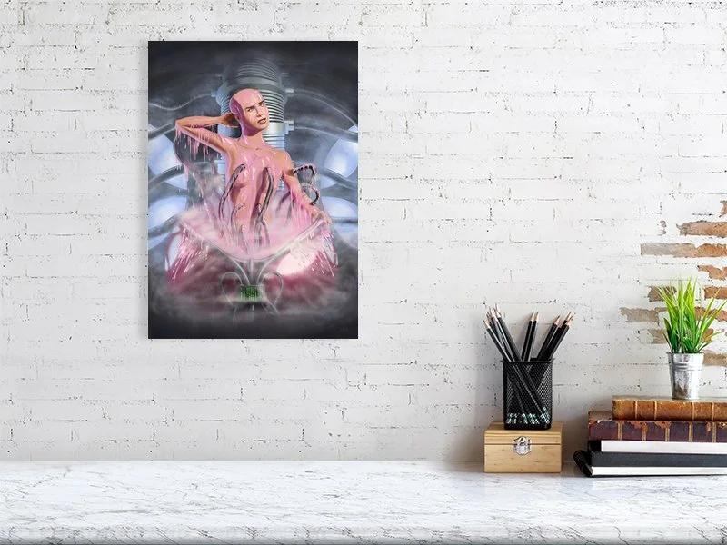 This digital painting captures the surreal, sci-fi atmosphere of the pod chambers with vibrant pink hues and striking industrial detail.